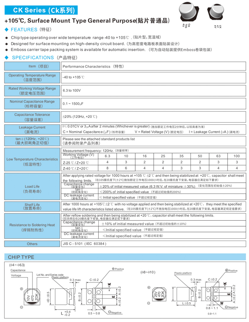 ● Chip type operating over wide temperature range -40 to +105"C . (贴片型,宽温域)