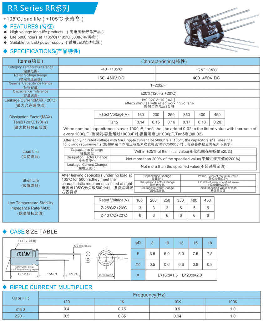 ● Life 5000 hours at +105°C(+ 105°C 5000小时寿命)