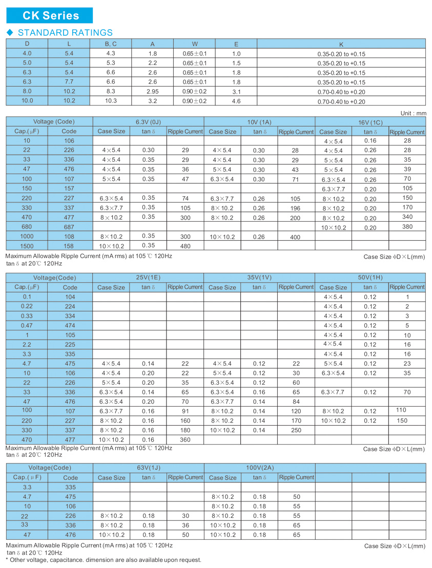 ● Chip type operating over wide temperature range -40 to +105"C . (贴片型,宽温域)